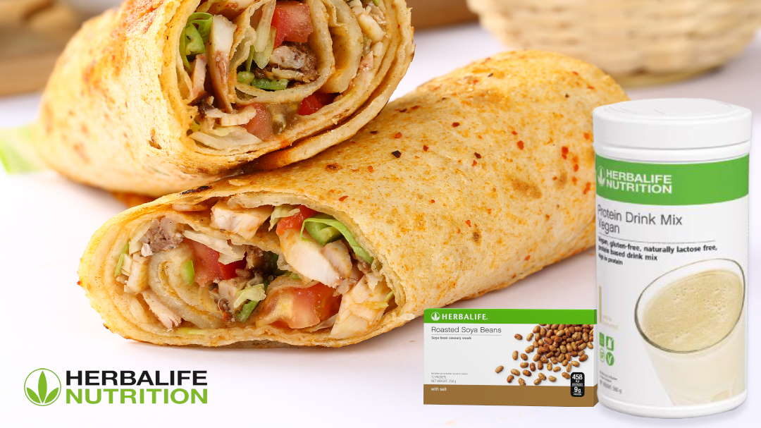 🌯 Preheat a non-stick saucepan and dry fry the vegan bacon for 2 mins on each side or until crispy. Place the bacon on top of the figs, Sprinkle the Roasted Soya Beans and roll the wrap up. Serve.